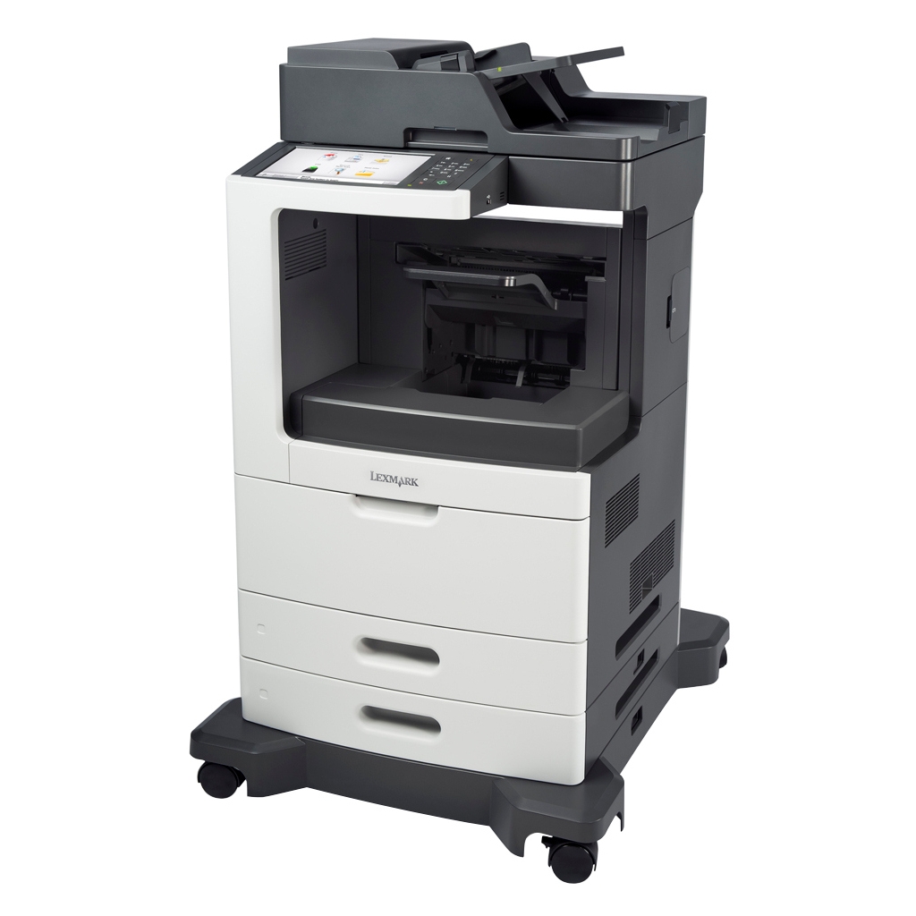 The Lexmark MX810de MFP with a customizable e-Task touch screen, 500-sheet offset stacker, 1,200-sheet standard input, 1GB of standard memory and 160+GB hard disk provides print, copy, fax, email and scan functions.